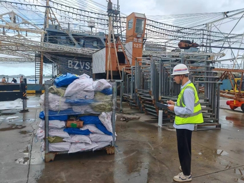 19日凌晨04:30作业人员到部门集合,准备好作业资料后出发,于07:30到达东山旗滨码头,码头在09:00正式开始作业。卸船作业时,工人从船舶冷冻舱将冻鱼搬上输送带运到甲板,再堆叠到货架上,最后用吊机调到岸边平板车上运走,厦门中联理货员负责对堆叠在货架上的货物进行点数。由于冻鱼叠放不规则,每一次摆放在货架上的数量也不一样,雨天视线不好,增加了清点冻鱼数量的难度。为保证作业质量,现场理货员按照清点、复核货物数量、拍照留证的顺序分工协作、有条不紊开展工作,并及时做好计数单的汇总,掌握时时的作业进度,确保作业数据准确无误。晚上22:50经过14个小时的连续作业,顺利完成6000件冻鱼的理货任务。