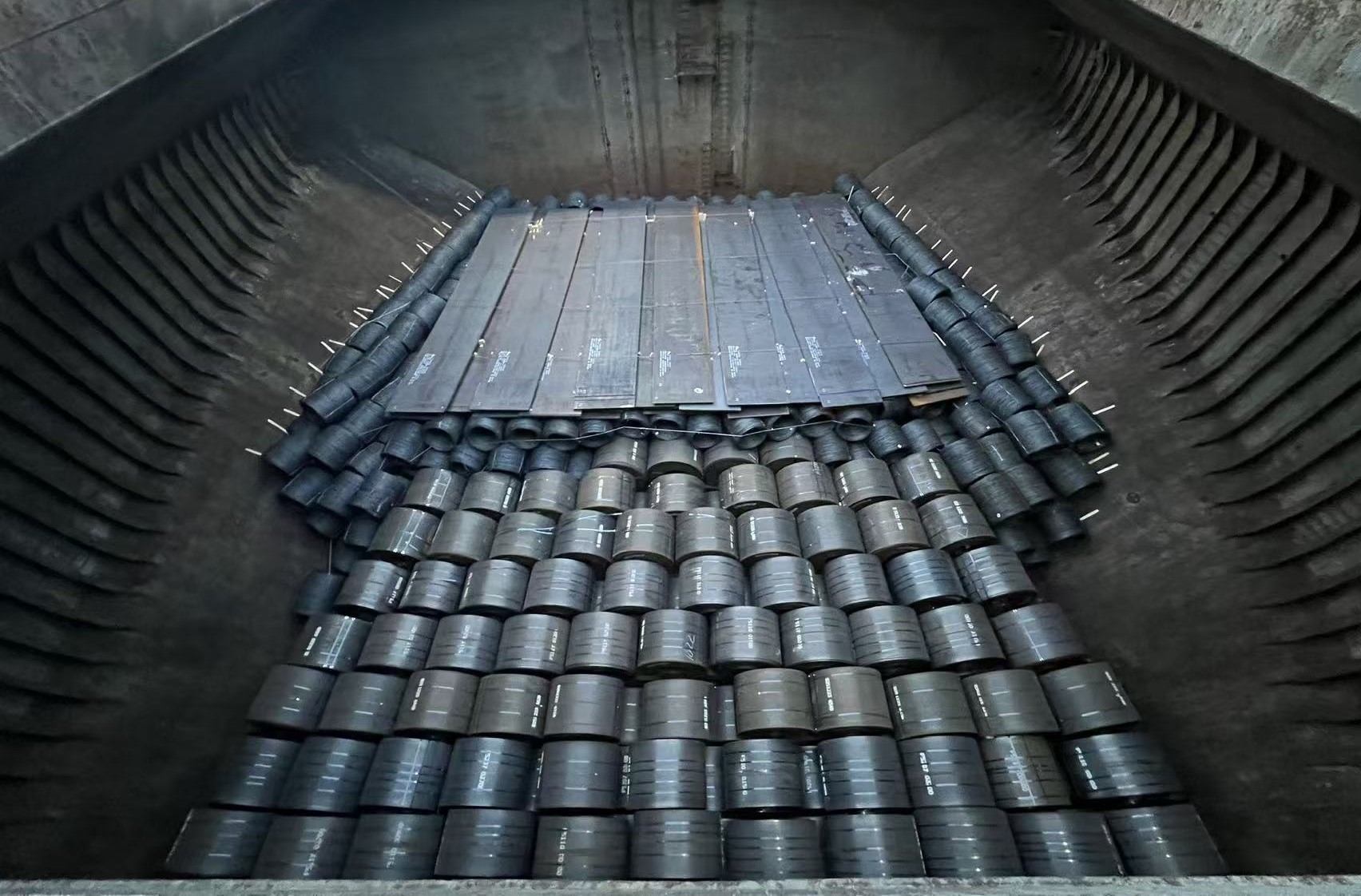 本次作业的难点,不仅体现在货物票数的庞大,更凸显于舱内配载方案的精细与复杂。船舶的五个货舱均采用“多港同装”模式,同一舱内需装载多个港口的货物,这对理货人员的空间记忆、信息分辨及现场协调能力构成了严峻考验。货物涵盖钢板、冷卷、热卷、盘圆等具有不同物理特性的钢材品种,不同货类在装卸工艺、积载要求与理货方式上均存在显著差异。尤为关键的是,盘圆类货物可承压、钢板需平铺、卷钢须固定等特性,要求理货人员要具备丰富理货知识,在分票、计数、验残等环节中实现精准识别与分类处理。