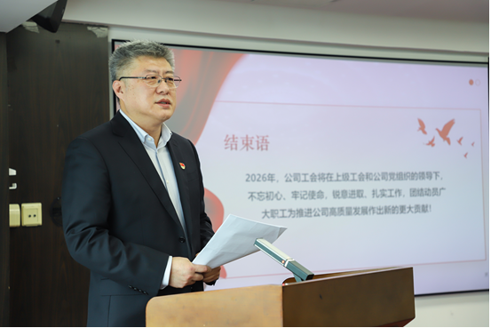 公司常务副总经理、工会主席唐益强作题为《凝心聚力促发展 服务员工谱新篇》的工会工作报告。报告总结2025年公司工会在思想引领、服务职工、文体活动、自身建设等方面的工作成效,提出2026年工会工作安排。工会将继续发挥桥梁纽带作用,用心用情服务职工,助力公司高质量发展。