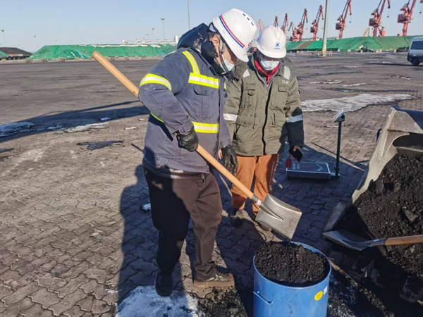 本次作业恰逢持续低温天气,作业团队不畏严寒,携带设备穿梭于各堆场之间。仔细核对每一处货堆信息、规范完成每一次取样操作,对冻结货堆采用专业工具小心处理,保证取样代表性,避免货物损耗。从清晨到日暮,作业团队始终以高标准、严要求推进各项工作,不放过任何细节。历时15天,作业团队高质量完成港区库存商品检验鉴重业务,得到了客户的赞许。